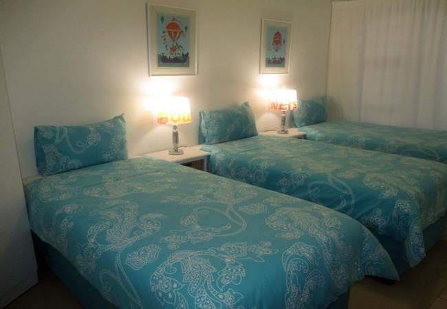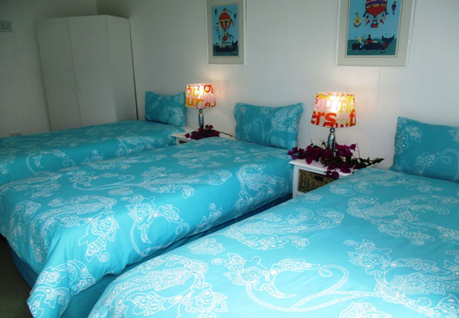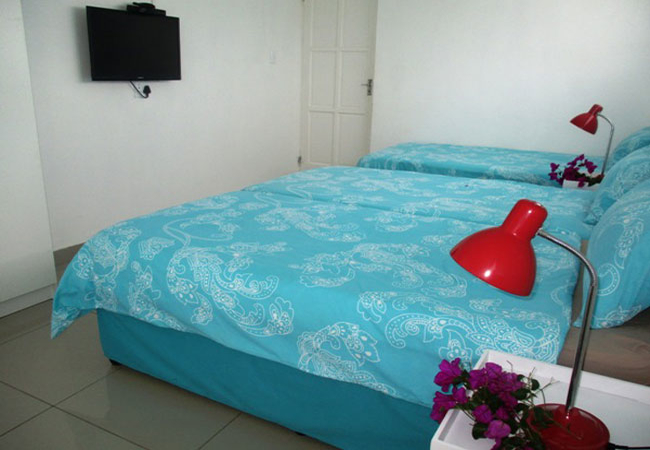 The Family Room is furnished with four single beds with bedside tables, bedside lamps and cupboards. The en-suite bathroom is fitted with a shower, toilet and basin. The room has a 32-inch flat screen TV with DStv decoder (guesthouse package), Guests have access to communal kitchen, lounge, dining room and courtyard.