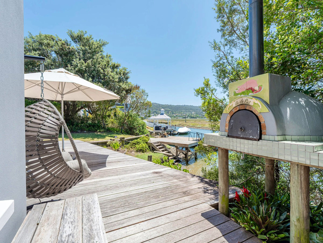 The holiday home offers four well-appointed bedrooms and three bathrooms, comfortably accommodating up to eight guests. The main bedroom is fitted with a king-size bed and features an en-suite bathroom equipped with both a bath and a shower. The second bedroom also includes a king-size bed and an en-suite bathroom with a shower. The remaining two bedrooms are each furnished with king-size beds and share a bathroom fitted with a shower, providing ample space and comfort for families or groups. The open-plan living area comprises a welcoming dining space and a lounge with a fireplace, television and plush seating, ideal for relaxed evenings indoors. The fully equipped kitchen includes a double-door fridge-freezer, gas stove, oven, coffee machine, toaster and microwave, while a dishwasher, washing machine and tumble dryer ensure everyday convenience is well taken care of. Guests have access to braai facilities, complimentary Wi-Fi and secure parking. The covered patio invites leisurely outdoor dining, with the added pleasure of a pizza oven for informal gatherings. Surrounded by manicured gardens and offering expansive views across the estuary, the property boasts a private jetty and direct canal access, delivering an authentic and unhurried coastal living experience.