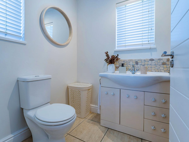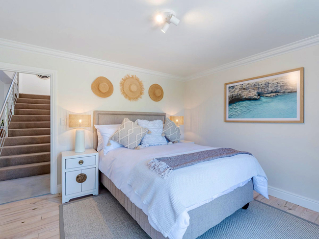 The holiday home offers four well-appointed bedrooms and three bathrooms, comfortably accommodating up to eight guests. The main bedroom is fitted with a king-size bed and features an en-suite bathroom equipped with both a bath and a shower.