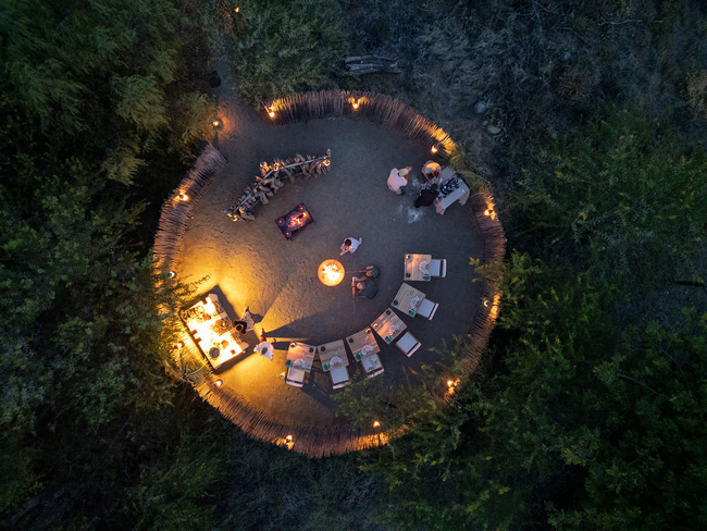 Guests dine in a beautifully designed dining room adjacent to a comfortable bar area. A smaller breakfast room, located next to the kitchen, can also serve as a study. When the weather is pleasant, candlelit dinners are served on the veranda beneath a Jacaranda tree adorned with purple flowers or in the bush under a starry sky. Pre-dinner drinks are enjoyed in the Karoo-style boma, crafted from a repurposed water reservoir, offering a cozy spot around the fire.