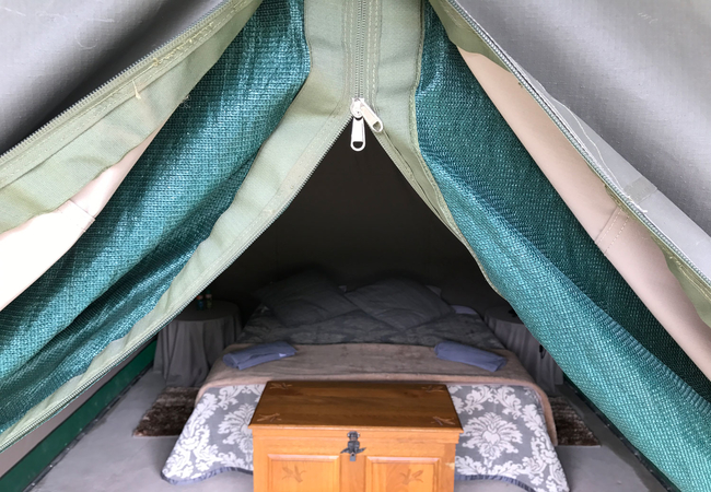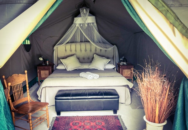 These luxury tented rooms have a King-size bed. These units make use of the communal garden showers and bathroom amenities.