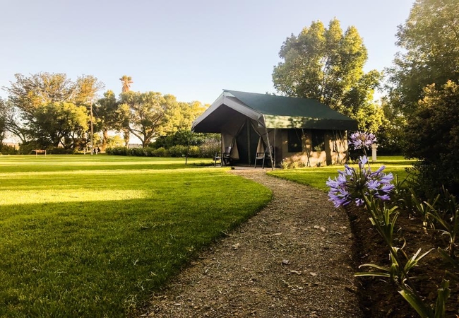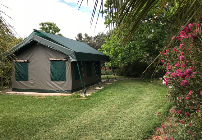 Luxury tented rooms with a King size bed, electricity, table, chairs, patio overlooking wild olive trees, beautiful lawn and lucious garden. Close to the unique garden showers and bathroom amenities.