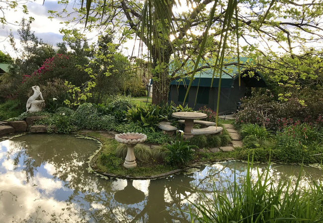Luxury Tented room with 2 x single beds, lights, plugs, table, chairs and patio overlooking palms, water feature and luscious garden. In close proximity of garde showers and bathroom amenities.