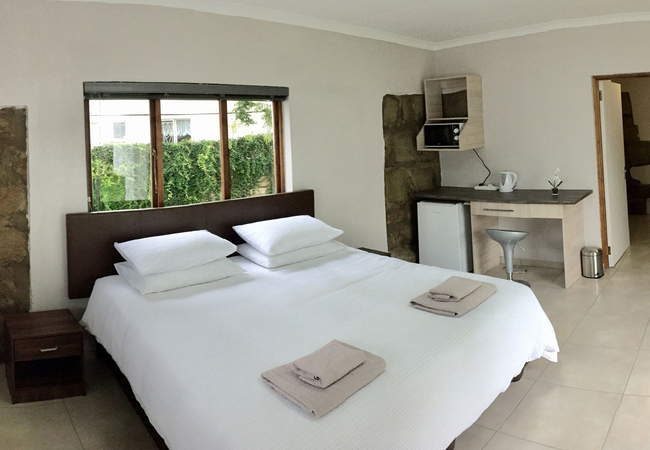 Bedrooms are furnished with a King-size bed. Rooms have an en-suite bathroom with a shower. All linen and towels are provided and the bedrooms are serviced daily. The room has a kitchenette and is equipped with a bar fridge, microwave and tea / coffee making facilities.