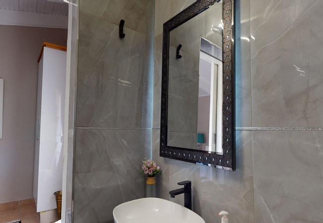 The living area has a dining table and a corner couch with a flat screen TV and DStv / satellite channels. There is air conditioning.
