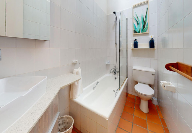 The first bedroom has a King-size bed and an en-suite with a shower-over-bath. The second, third and fourth rooms each have to single beds. The second bedroom has an en-suite bathroom with a shower over the bath. And there is another shared bathroom with a shower.