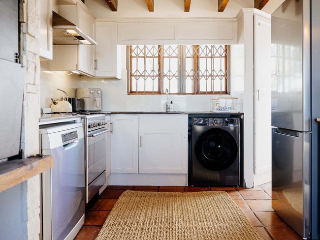 The open-plan kitchen, dining, and living area creates a welcoming space for shared moments. The kitchen is fully equipped with a fridge-freezer, stove, oven, indoor braai, microwave, air fryer, kettle, and washing machine, complemented by a dining table for leisurely meals. The living area features a TV with DStv, and the property offers free Wi-Fi throughout.