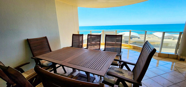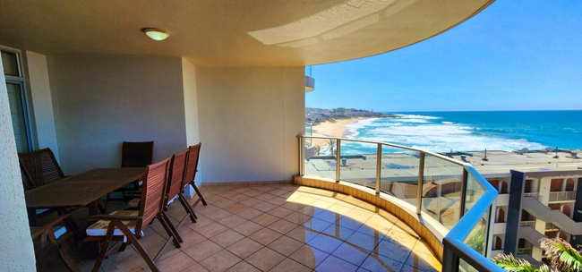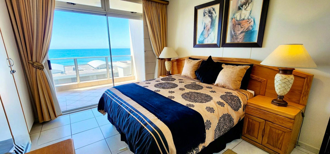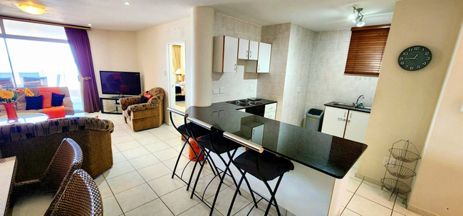 The apartment includes a modern, fully equipped kitchen with a fridge, stove, dishwasher, and microwave. The lounge offers seating for six, a flat-screen television, and a selection of DSTV channels. A large balcony extends from the lounge, complete with patio furniture and a built-in gas braai, providing an ideal spot to enjoy the sea views.