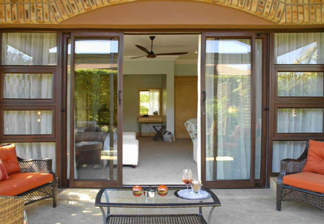The Deluxe Rooms have an extra large bed and en-suite bathroom with a bath and shower. There is also a private balcony / patio and an outside shower in each room. All the rooms have a Minibar, tea / coffee facilities, sitting area, bathrobes, slippers, hairdryer, TV with satellite channels, personal safe, Wi-Fi and complimentary toiletries.