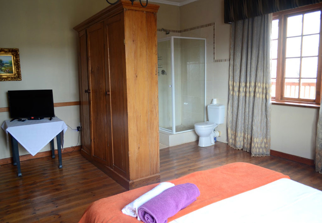 The Double room is furnished with a double bed and an en-suite bathroom with a shower. There is a TV with limited DStv and tea and coffee making facilities. The hotel has a guest lounge, braai area and Wi-Fi available for your use. Secure parking is provided.