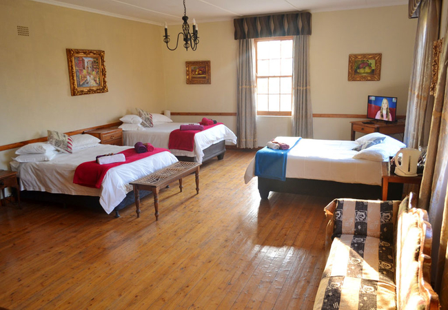 The family rooms have two double beds and an en-suite private bathroom. There is a TV with selected DStv and tea and coffee making facilities. The hotel has a guest lounge, braai area and Wi-Fi available for your use. Secure parking is provided.