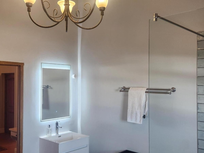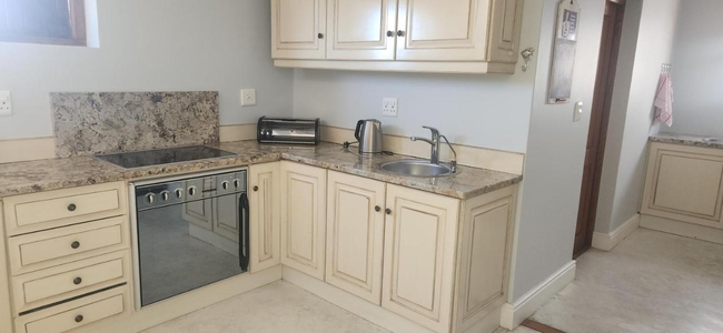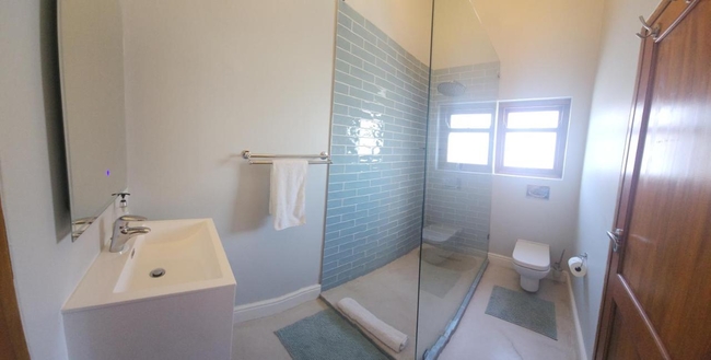 On the ground floor, you'll find the kitchen, dining, and living areas. The kitchen is fully equipped for self-catering, including a stove, oven, fridge-freezer, and microwave, with a scullery housing a dishwasher. The dining area has an eight-seater table and a built-in indoor braai fireplace.