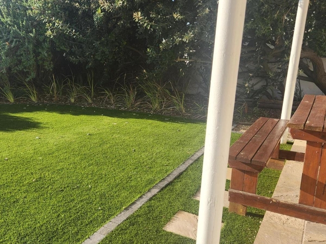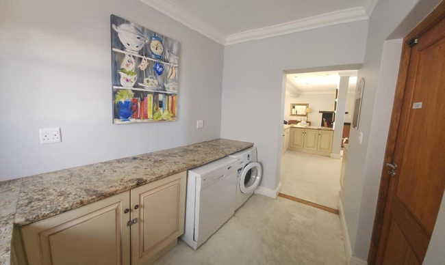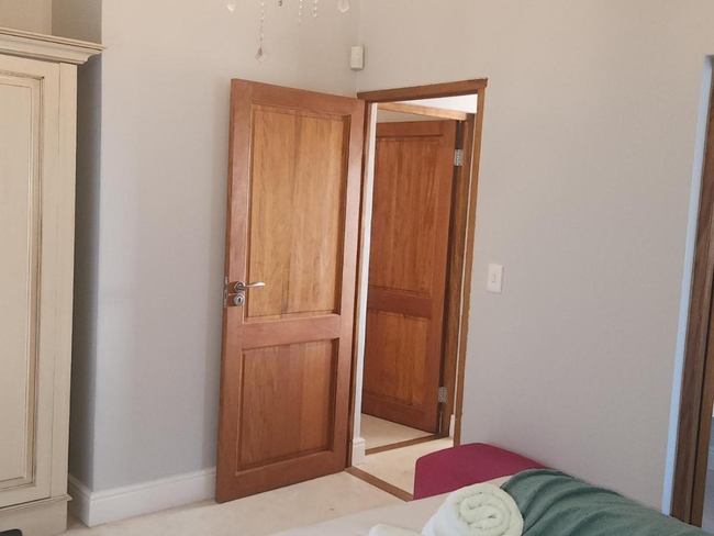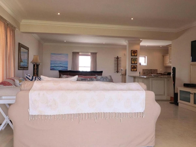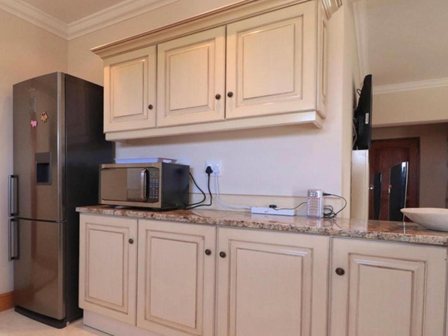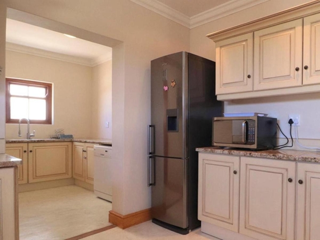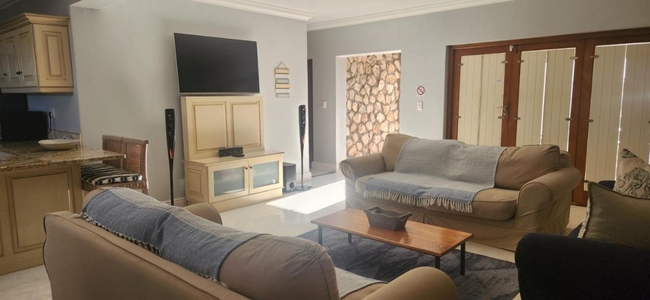 This spacious home accommodates up to six guests with three bedrooms, two bathrooms, a gourmet kitchen, separate scullery and laundry room, and an open-plan lounge and dining area. The upper floor contains the bedrooms and bathrooms. The master suite features a king-size bed, an en-suite bathroom with a bath and handheld shower, and access to a private covered balcony. The second and third bedrooms each have a queen-size bed and share a bathroom with a bath and handheld shower. An upstairs TV lounge opens to a balcony with built-in braai facilities. On the ground floor, you'll find the kitchen, dining, and living areas. The kitchen is fully equipped for self-catering, including a stove, oven, fridge-freezer, and microwave, with a scullery housing a dishwasher. The dining area has an eight-seater table and a built-in indoor braai fireplace. The lounge includes a flat-screen TV with full DStv access and opens to a sheltered patio with outdoor braai facilities. A tandem garage provides secure parking for two vehicles. The property features a well-kept walled garden and offers limited partial sea views.