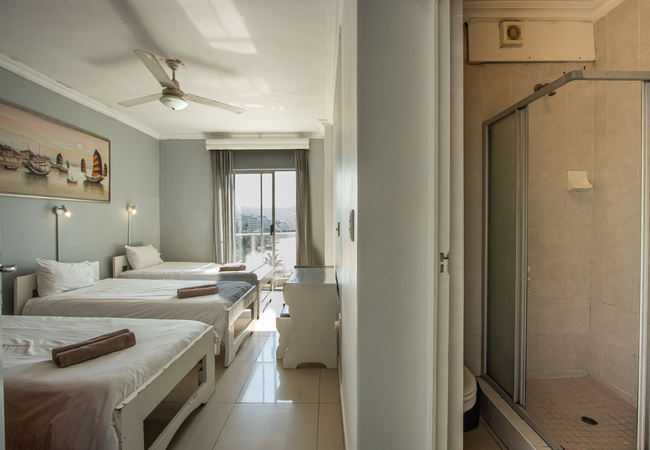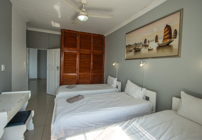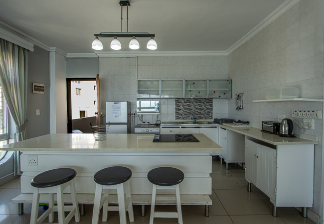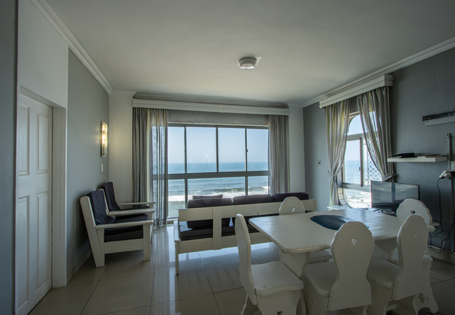 Seagull 501 is a self catering holiday apartment in Margate with two bedrooms. The main bedroom is furnished with a double bed and the second bedroom is furnished with three single beds. Linen is supplied. The first bathroom is fitted with a bath, toilet and basin. The second bathroom is fitted with a shower, toilet and basin. Please bring your own towels and toiletries. The kitchen is quipped with a fridge, microwave, toaster and kettle. There is a dining table and a lounge area with a TV and selected satellite channels. Guests should bring their own decoder should they prefer more channels including sport channels. There is no Wi-Fi available. The living area has large windows overlooking the sea. There is one free parking bay for each unit, additional parking and trailer parking can be arranged at an additional fee. Enjoy the wonderful view of the main beach while relaxing in our own infinity pool. Various braai areas and a paid laundry facility are available on the premises. We have a children's playroom and a giant chess set.