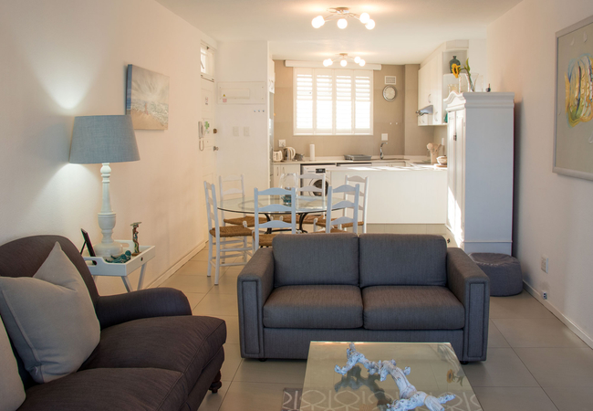 The comfortable living area opens via sliding doors onto the furnished balcony which boasts beautiful views of Umhlanga and the Indian Ocean.
