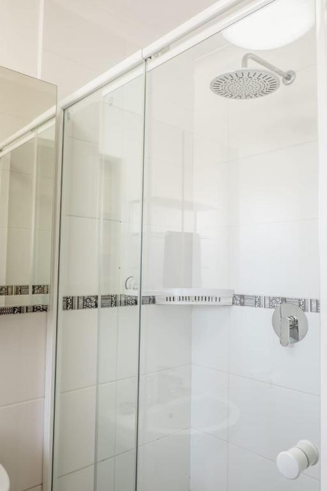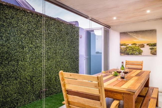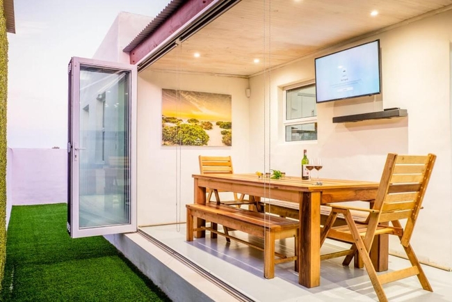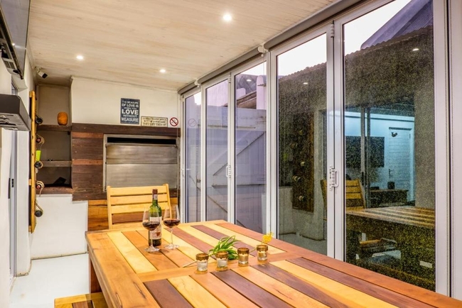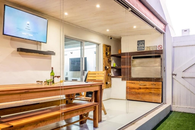 Step through the sliding doors to an enclosed patio, complete with a dining table, a second TV, and a built-in braai (BBQ), perfect for enjoying time with family and friends. The patio opens onto a charming garden, providing a peaceful space to relax outdoors. Plus, with the beach just 800m away, the sea is always within easy reach.