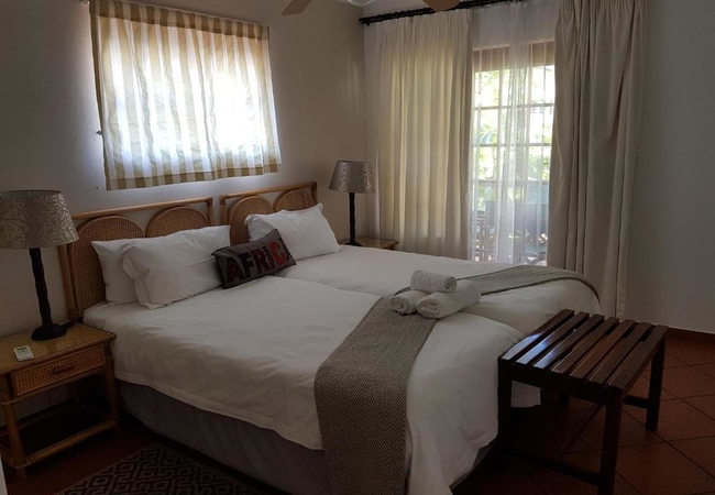 1 bedroom upstairs with twin beds, air-con and bathroom with bath and shower, 1 bedroom downstairs with twin beds. Ceiling fan, bathroom with shower. Lounge/kitchen downstairs and braai/BBQ outside.