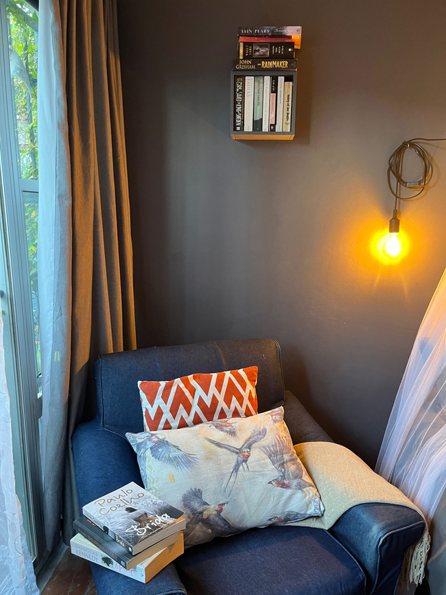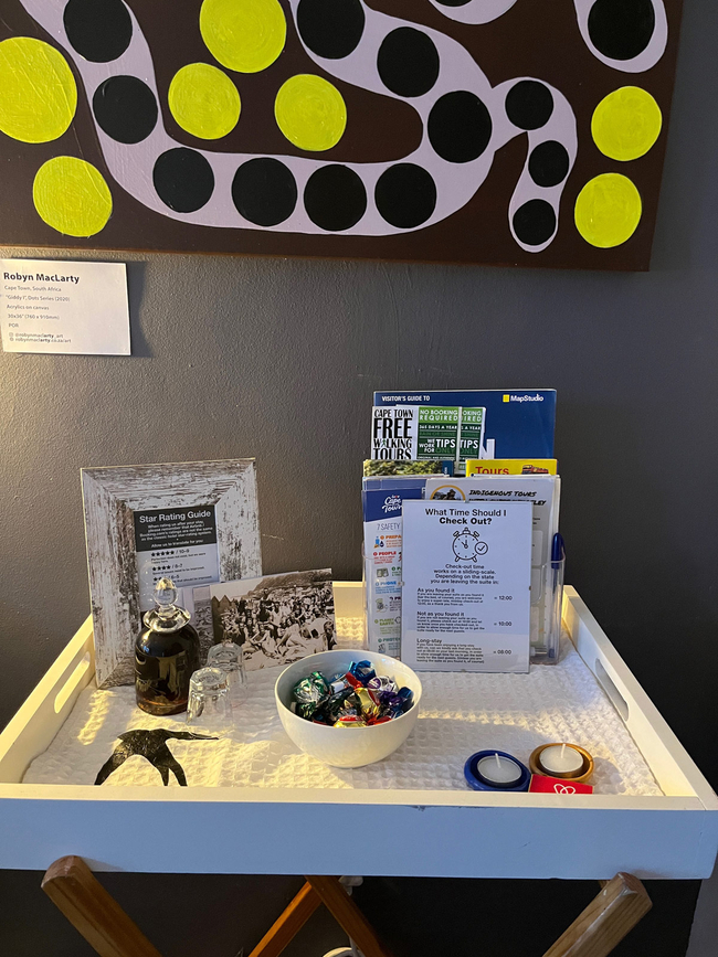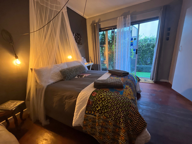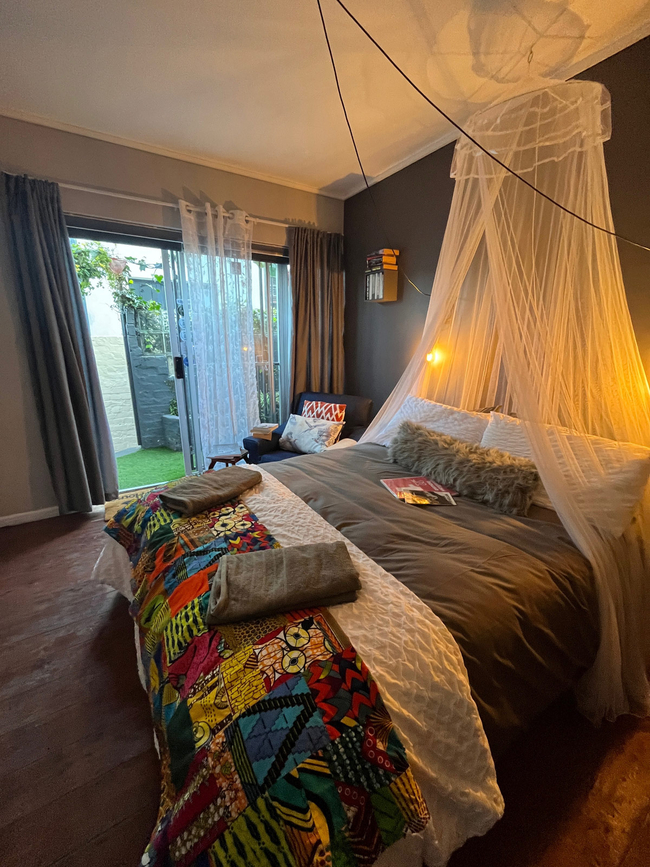 The stylish, wooden floor bedroom has a double bed with romantic mosquito net and over-sized carbon globes for reading. The private, walk-in, en-suite bathroom has a bath and shower. The kitchenette has a bar fridge, kettle, microwave, induction plate, toaster, crockery and cutlery. Each suite also has a courtyard with a solar water feature and a small braai. There is free Wi-Fi available as well as an outdoor shower.