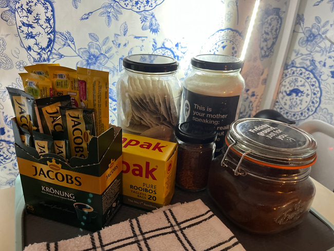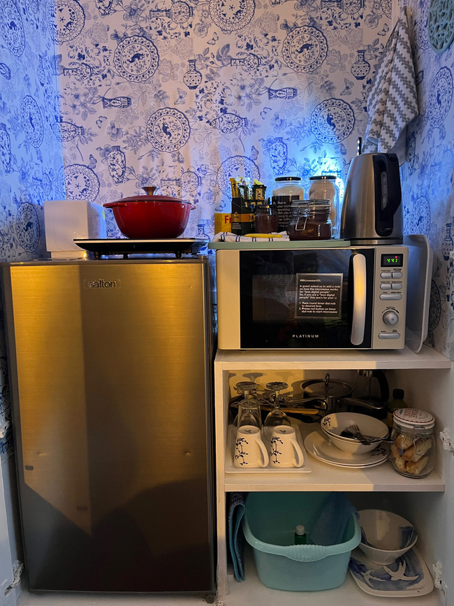 The kitchenette has a bar fridge, kettle, microwave, induction plate, toaster, crockery and cutlery.