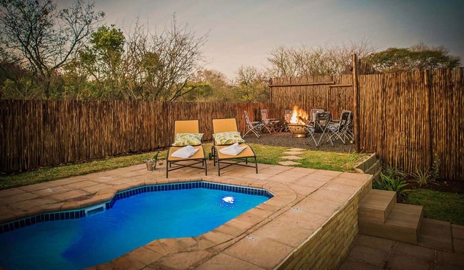 The main bedroom features a double bed, while the second bedroom includes two single beds. The main bedroom has an en-suite bathroom with a shower, bath, or both, along with a toilet and basin. A second bathroom also offers either a shower, bath, or both, as well as a toilet and basin. The rooms are spacious, filled with natural light, and styled with a modern flair. Each room includes a private patio, TV, coffee bar, and air-conditioning, with direct access to the entertainment area. The unit also features a modern, open-plan kitchen equipped with a stove, oven, fridge-freezer, microwave, coffee- and tea-making facilities, crockery, and cutlery, along with a comfortable living and dining area. Outside, guests can enjoy a braai area and fire pit, making this unit ideal for friends seeking a weekend retreat or extended families looking for a relaxing getaway.