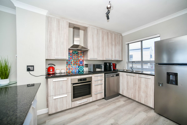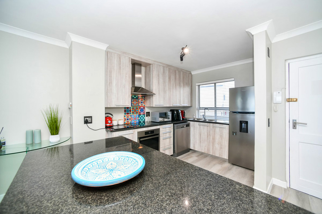 The living space is open-plan, creating a welcoming environment for both relaxation and entertaining. The modern kitchen is fully equipped with a fridge-freezer, stove, oven, microwave, air fryer, cutlery, crockery, and a Nespresso machine. A sleek countertop with stools adds a casual dining option, while a dishwasher makes mealtimes more convenient. The lounge area is comfortably furnished and features a Smart TV with Netflix as well as complimentary Wi-Fi. To ensure uninterrupted convenience during load-shedding, a plug-and-play inverter is provided for powering essential devices.