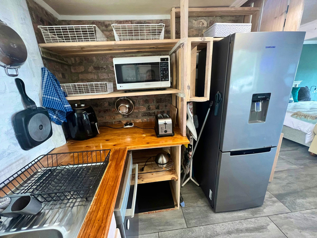 Ideal for two guests, this stylish apartment offers one bedroom and one bathroom, thoughtfully designed for comfort and convenience. The bedroom is furnished with a king-size bed, while the en-suite bathroom includes a shower, toilet, and basin. The open-plan living area features a fully equipped kitchen, complete with a fridge-freezer, microwave, air fryer, two-plate stove, kettle, toaster, and a full set of cutlery and crockery. A dishwasher is also included to make cleanup effortless. The lounge area provides comfortable seating and is fitted with a smart TV offering access to Netflix and YouTube, along with complimentary Wi-Fi for streaming or browsing. Outdoors, guests can enjoy a dedicated dining space and a braai area for relaxed meals and social evenings. Secure parking is available on the premises for added peace of mind.