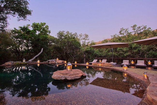The lodge's four high-end double villas and one spacious family suite offer breathtaking views of the reserve and are within walking distance of the main lodge. Here, you'll find a well-stocked bar, a lounge area with two fireplaces, an infinity pool with a sundeck, and an entertaining Boma dining area that makes mealtime spectacular.