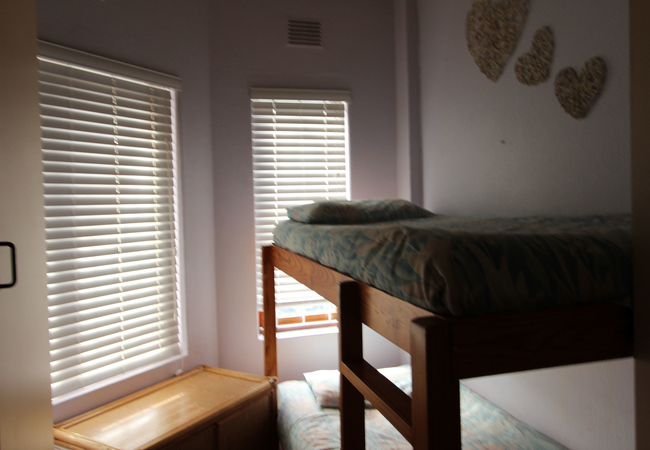 The first bedroom is furnished with a double bed and the second has two bunk beds, sleeping four people.