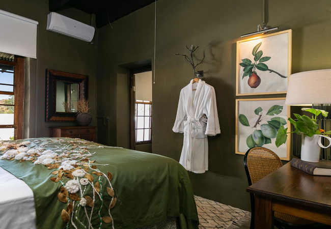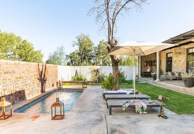 Seisoen is located not far from the main guest house and has two bedrooms. The first bedroom is furnished with a King-size bed and has an en-suite bathroom fitted with a bath, shower, toilet and basin. The second bedroom is furnished with two single beds and has an en-suite bathroom fitted with a bath/shower combo, toilet and basin. There is a fully equipped kitchenette and a living area with a fireplace. Outside is a patio, garden and a private pool.