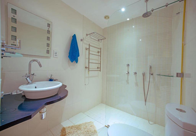 The main bedroom is furnished with a King-size bed, the second bedroom is furnished with a Queen-size bed and the third bedroom is furnished with two single beds.