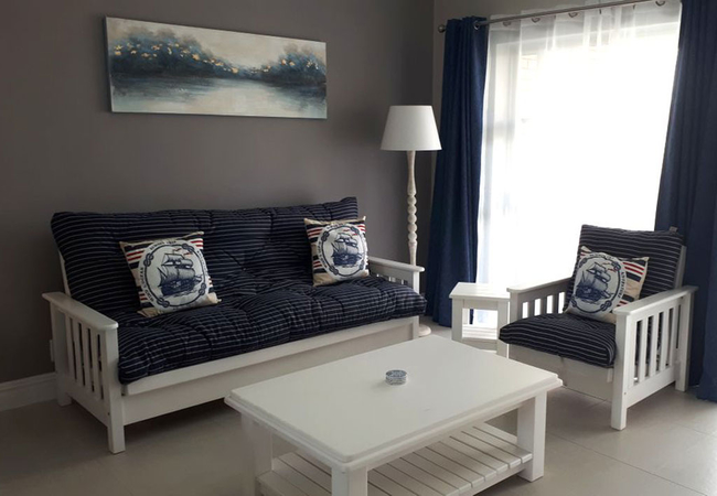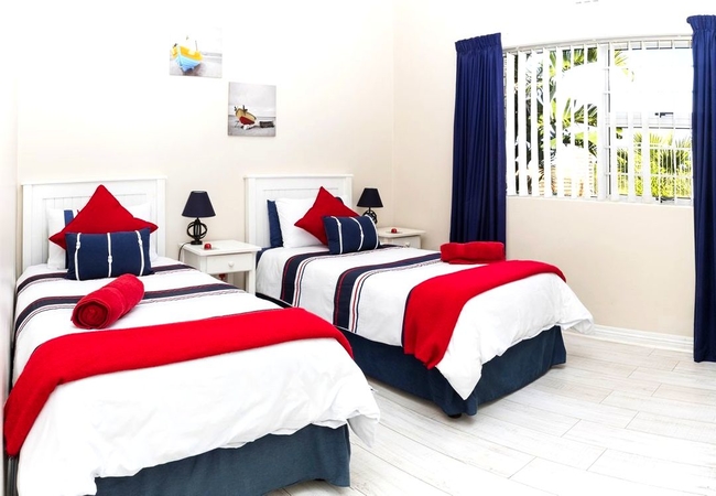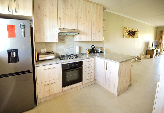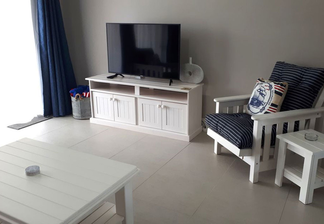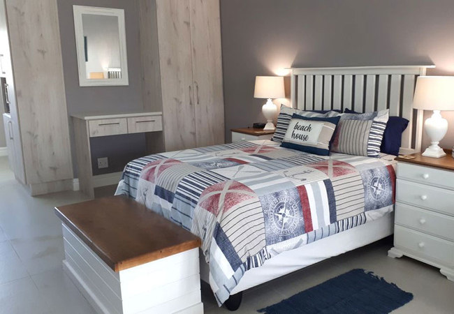 Unit Seven is a three bedroom house. The main bedroom is fitted with a Queen-size bed has an en-suite bath room. The second bedroom is fitted with a Queen-size bed. The third bedroom is fitted with a Queen-size bed. The second bathroom is situated between the second and third bedroom. The bathroom consists of a bath, shower, basin and toilet. Towels are provided. The lounge area seats six persons comfortably. Fully equipped kitchen with all modern utensils has a gas hob. There is also a patio with braai facilities. Parking is available on site.