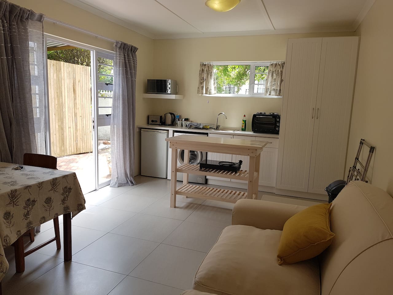 The separate living area contains comfortable couch and a dining table. The semi equipped kitchenette consists of microwave, toaster, kettle, stove, oven, a bar fridge, hot plate, small oven and a washing machine. Outside on the patio there is outdoor furniture for guest use.