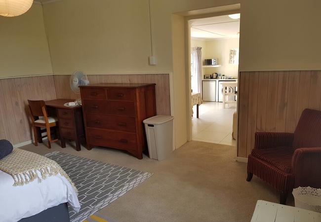 There is a separate living room with a comfortable lounge suite with a fireplace, heater and a wall-mounted TV. The kitchenette consists of a fridge / freezer, microwave, two-plate stove and an oven. There is an undercover patio with outdoor furniture for guests to use.