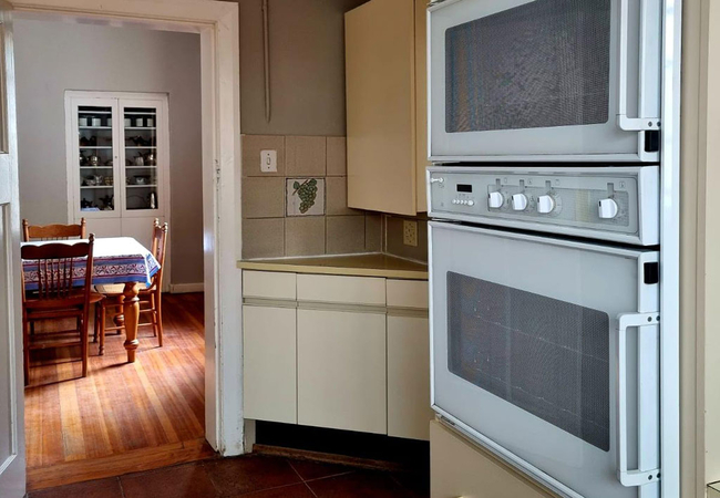There is a large kitchen with an eye-level oven, fridge, dishwasher and cooking utensils. There is a separate dining room and a lounge with a fireplace.