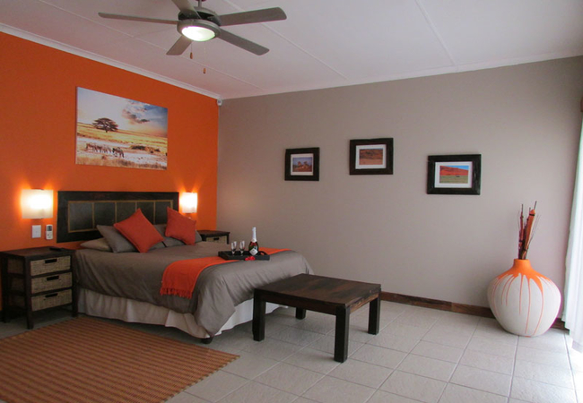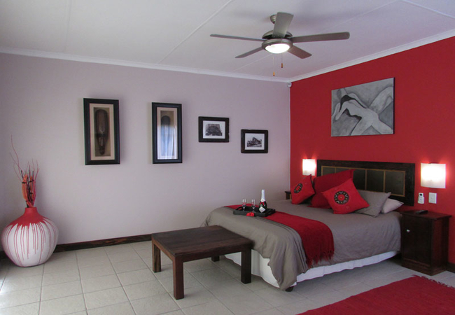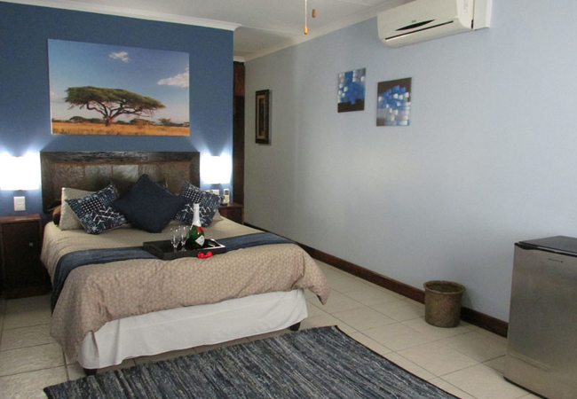 We have 13 rooms. All rooms are en-suite and have air-conditioning, a bar fridge, a flat screen TV (SABC 1, 2, 3, e-TV and five DStv channels) and coffee and tea making facilities for your convenience. Guest rooms are family rooms with queen size beds and a comfortable sleeper couch, while the remaining rooms are furnished with a double bed. All our rooms either have a lovely view or a very private setting.