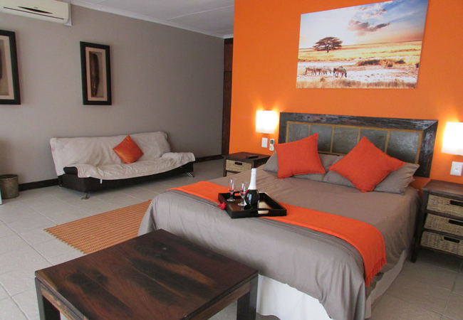 One bedroom with Queen-size bed and sleeper couch. All rooms are en-suite and have air-conditioning, a bar fridge, a flat screen TV (SABC 1, 2, 3, e-TV and five DStv channels) and coffee and tea making facilities.