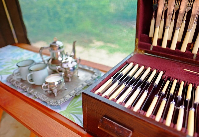 Culinary feasts are presented around the camp fire with exquisite silverware. And best of all, guests wake up to tea/coffee, served in front of their tents. There is also a classic portable bar with crystal glassware to enjoy the traditional gin and tonic on the viewing deck.