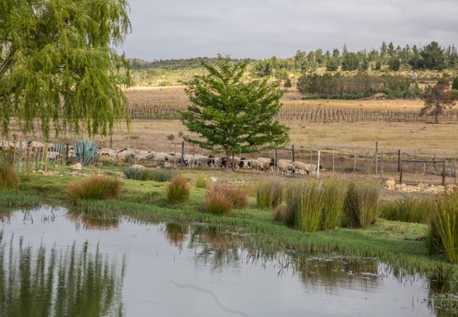 Guests can relax in the 2 lounge areas, one of which has a fireplace, or on the stoep that overlooks the farm and mountains.
