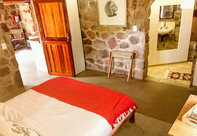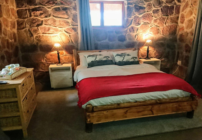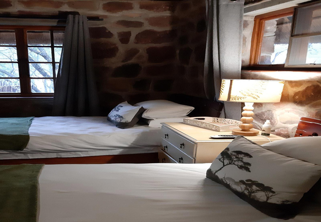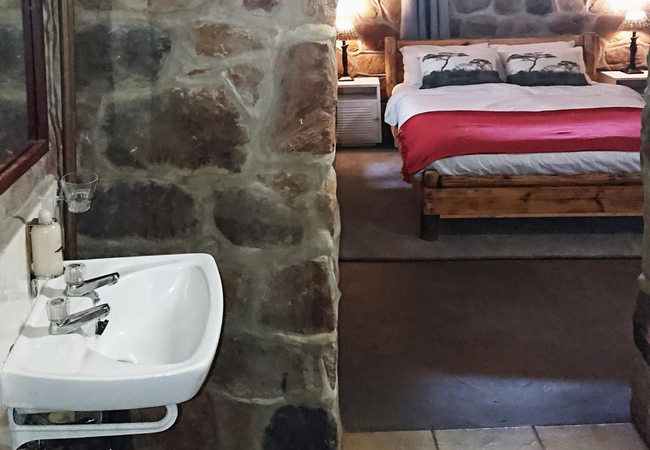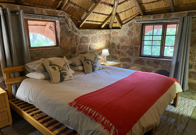 Reedbuck Cottage has two bedrooms. The main room has a Queen-size bed and en-suite bathroom with a shower. The second bedroom has two three quarter beds and an en-suite bathroom with a shower. The outside kitchens have a microwave, small table top oven / stove and a fridge. Braai facilities are also included.