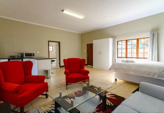 The Gorge Deluxe Room situated on the ground level with garden and pool views. It has a Queen-size bed and en-suite bathroom with a large separate shower and bath. All of the suites have a kitchenette with microwave and fridge, free Wi-Fi, TV with satellite channels, complimentary toiletries, and a hairdryer.