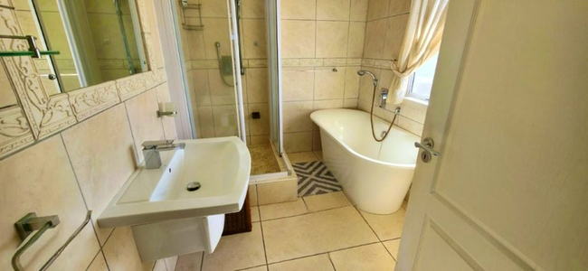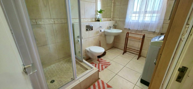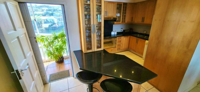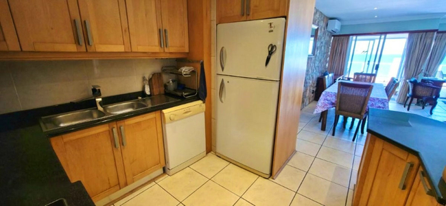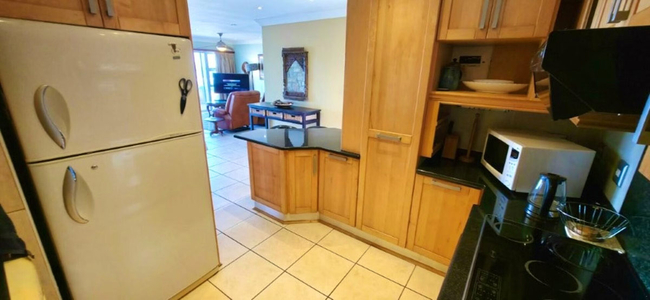 The generously sized lounge provides comfortable seating for four guests, along with a desk and office chair for those who may need a workspace while on holiday. This area is air conditioned and features a curved 50 inch smart TV with DSTV, which the owner will activate. Adjacent to the fully equipped kitchen is a dining area with seating for six. The kitchen includes a stove, fridge, washing machine, dishwasher and microwave, making it ideal for self catering.
