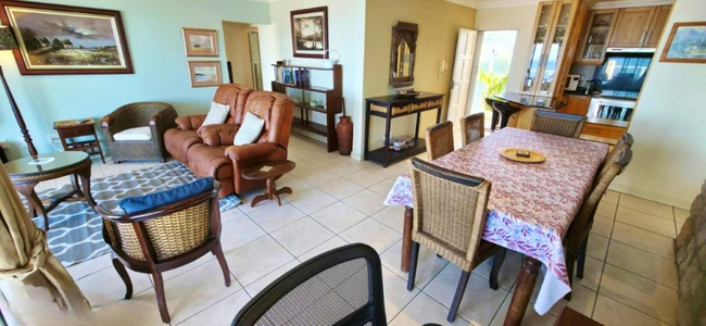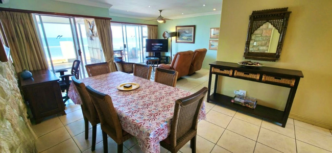 A partially covered balcony offers a gas braai and outdoor seating for four, while an enclosed patio off the main bedroom provides additional seating for four guests. Both outdoor areas showcase sweeping and spectacular ocean views. The complex also features a swimming pool and a communal braai area. The unit includes a private garage, and additional visitor parking is available on the ground floor.