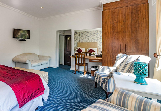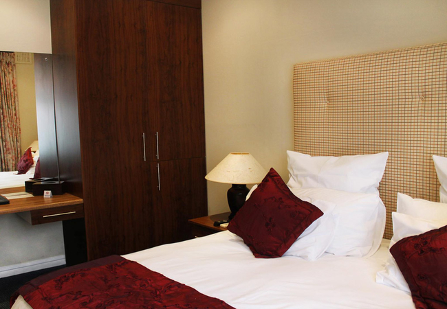 Each luxurious suite is fitted with a King-size bed or twin single beds on request and features an en-suite bathroom with a spa bath. Amenities include air conditioning, room safe, mini bar fridge, DStv / satellite channels(hotel bouquet), tea / coffee facilities and a desk.