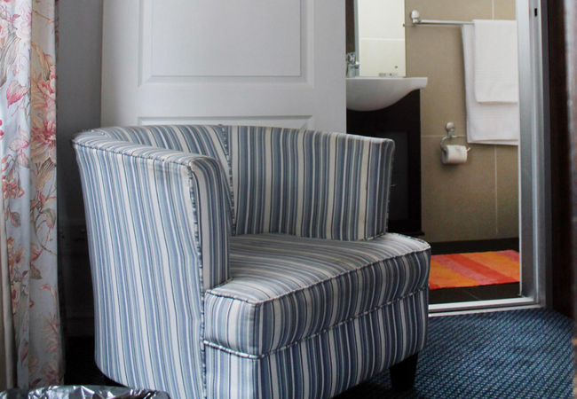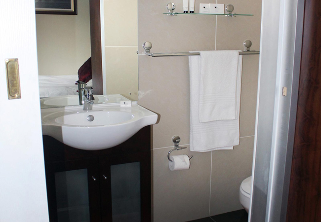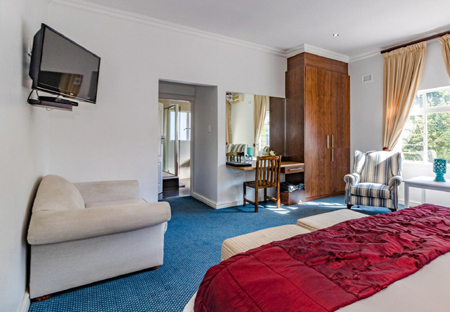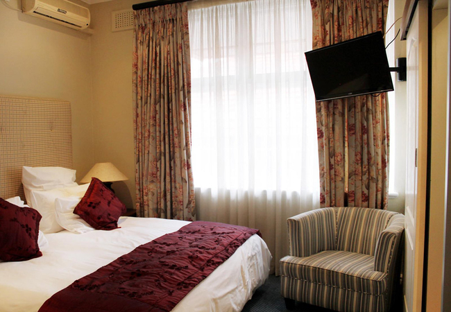 This cosy room is fitted with a single bed and has an en-suite bathroom with a shower, basin and toilet. Amenities include tea / coffee facilities, flat-screen TV with DStv / satellite channels (limited channels), air conditioning, safe, bar fridge and free high speed Wi-Fi.
