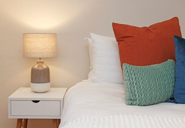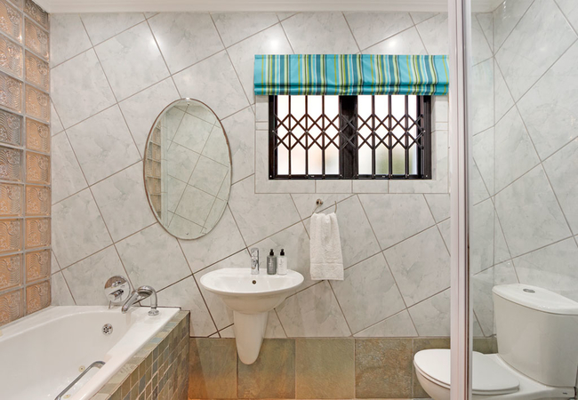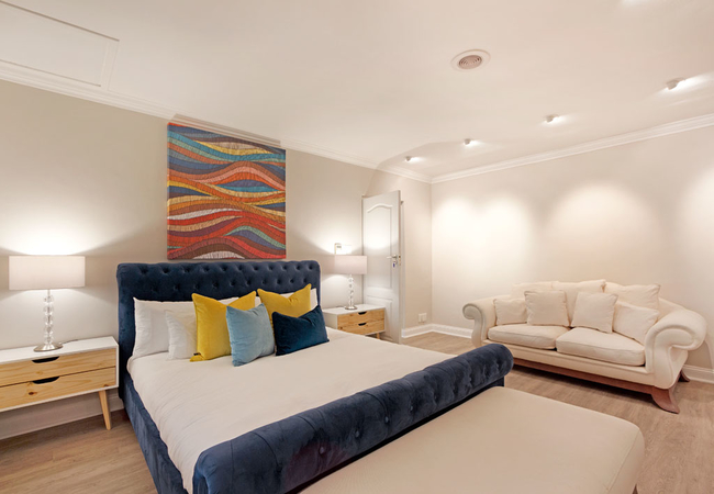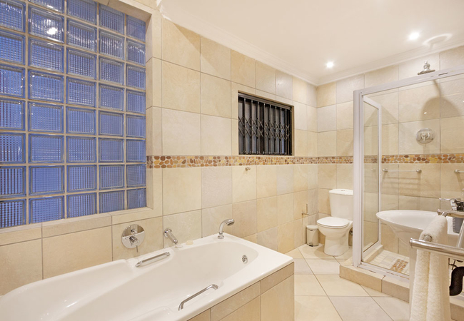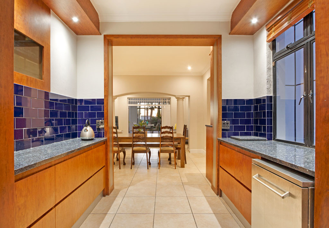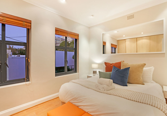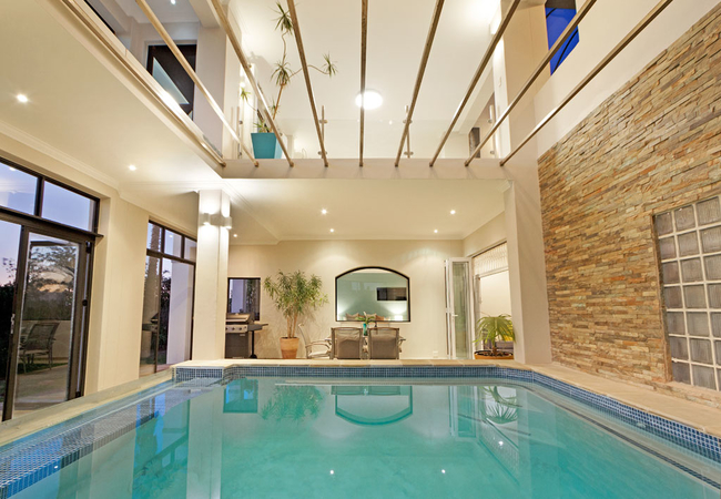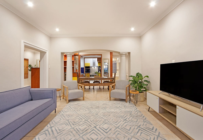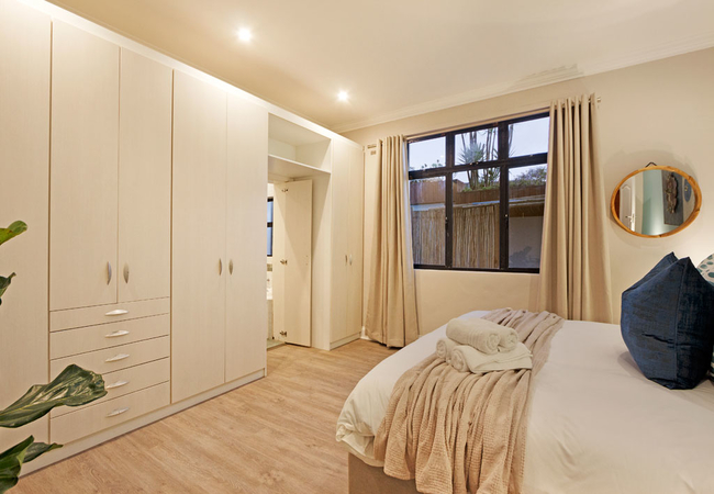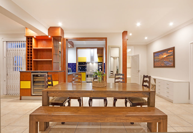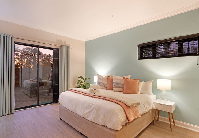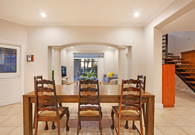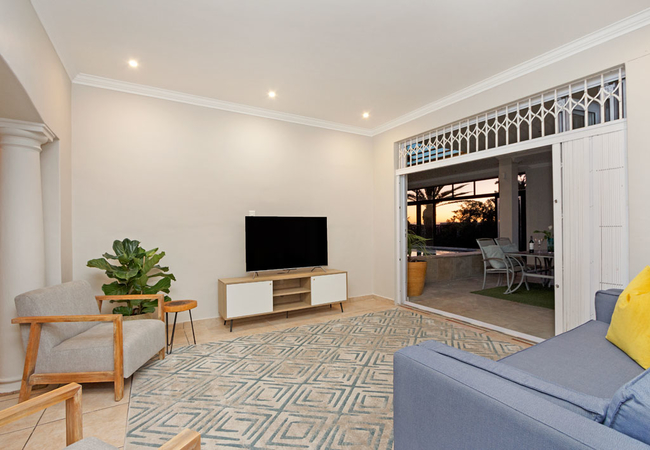 Sir David Baird 22 has five bedrooms, capable of comfortably accommodating up to ten guests. Each bedroom has a unique style that complements the home's overall soothing aesthetic. Three of the five bedrooms are furnished with a King-size bed, while the other two are furnished with Queen-size beds. Three bedrooms have a spacious en-suite bathroom, while the other bedrooms have access to the shared bathroom. The bathrooms are fitted with a bath, shower, toilet and basin. There is also a separate guest toilet. Large windows and soothing neutral and pastel shades with touches of wood are perfectly blended to create a welcoming space designed to inspire rest and relaxation. This unique home boasts multiple dining and sitting areas, allowing guests to relax together while still having the option (and room) for a little alone time as you binge your favourite series without interruption. Thanks to the open-plan design, there is an effortless flow from the kitchen to a dining area, lounge and garden. A notable highlight of this incredible home is the indoor entertainment area consisting of wraparound windows instead of walls, an indoor swimming pool, a dining area and a gas braai/BBQ, ensuring good times no matter the weather.