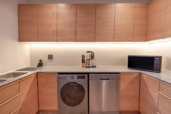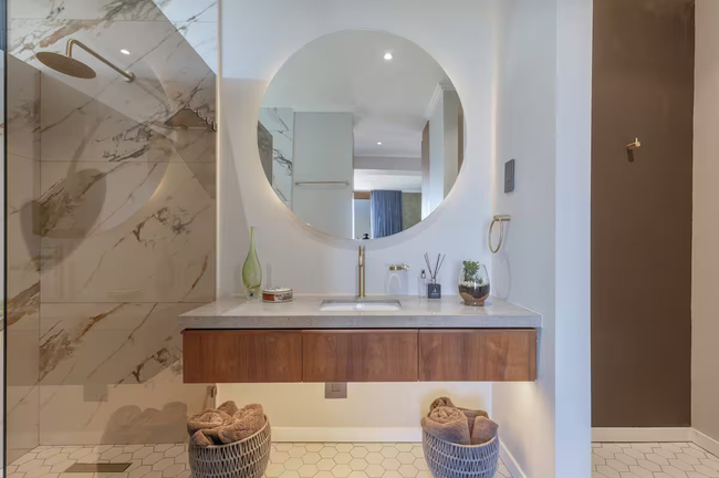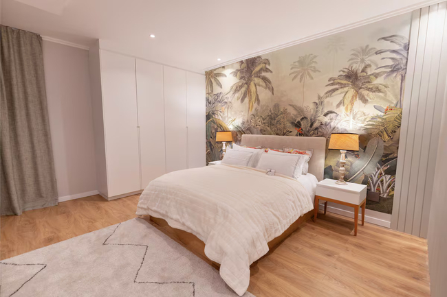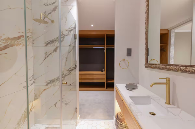 The main bedroom features a king-size bed with an en-suite bathroom complete with a shower, basin, and toilet. The second bedroom offers a queen-size bed with its own en-suite bathroom fitted with a bath, basin, and toilet. The third bedroom is furnished with a queen-size bed and includes an en-suite bathroom with a shower, basin, and toilet. High-quality linen and towels are provided for convenience.