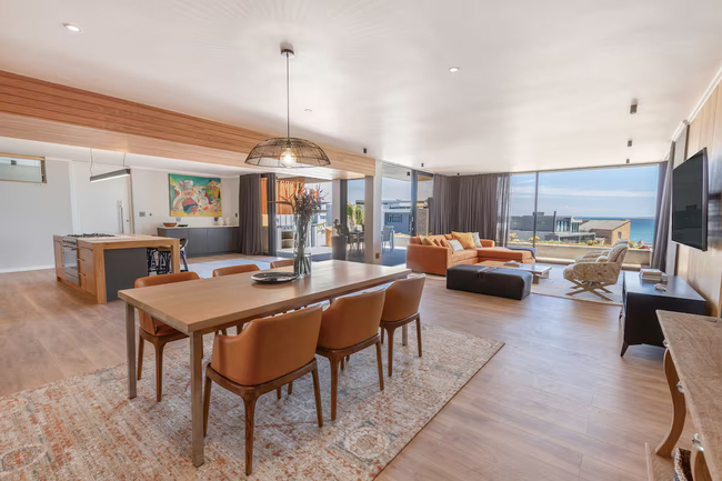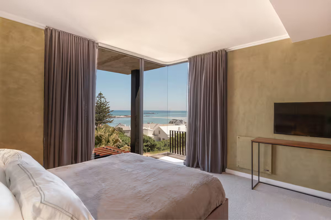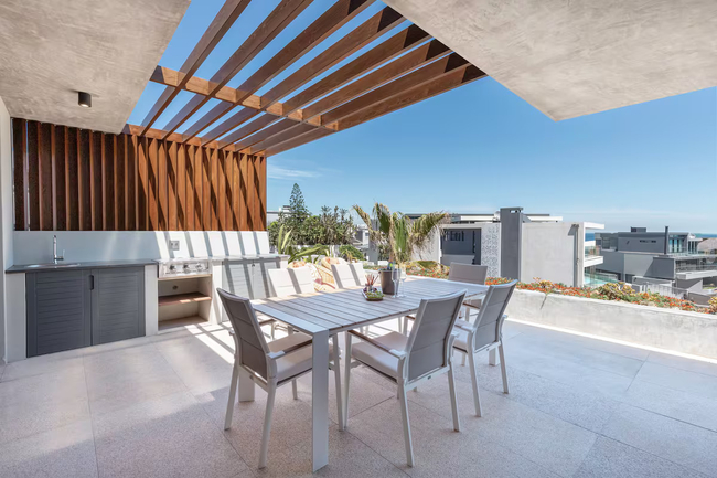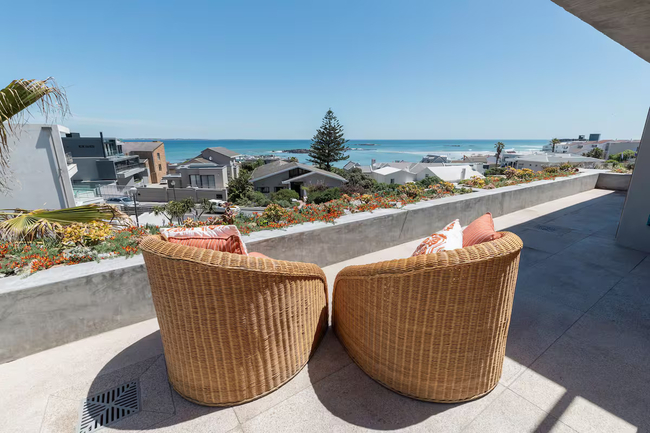 The balcony is an inviting outdoor space with a gas braai and a stylish dining table, ideal for enjoying alfresco meals. Guests can admire uninterrupted views of the ocean while relaxing with a drink and soaking in the beauty of the setting. The apartment is conveniently situated near a wide selection of restaurants, bars, and shops, ensuring easy access to entertainment and essential amenities.