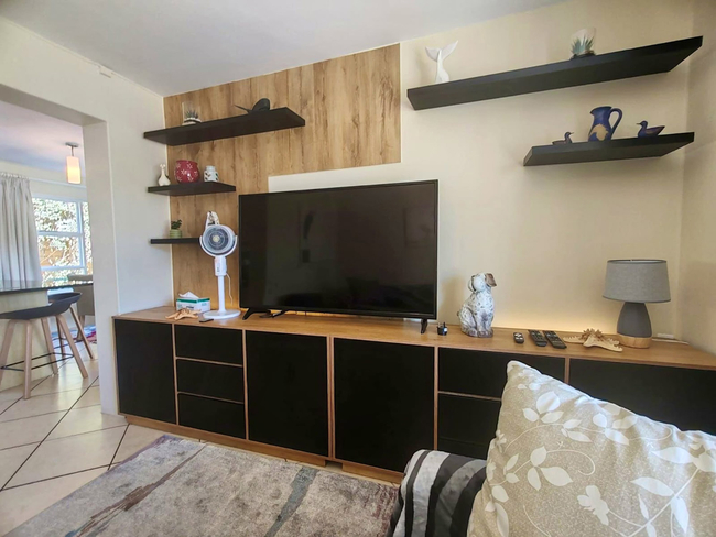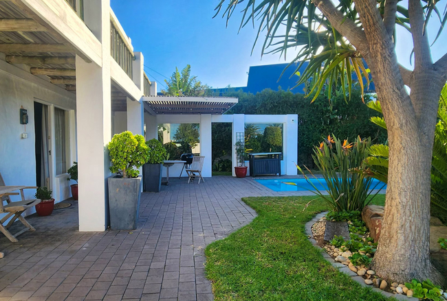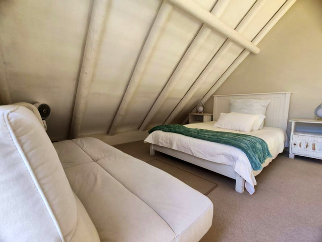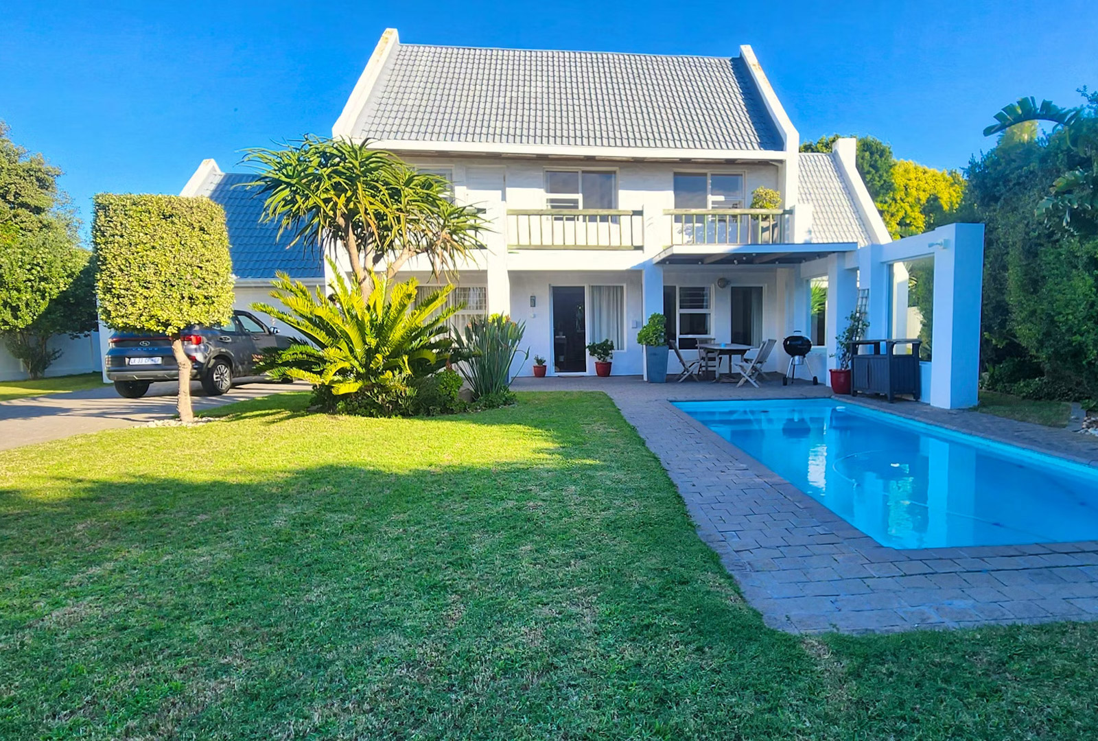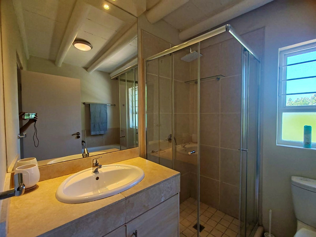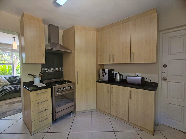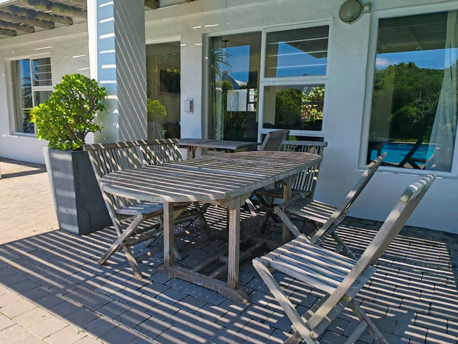 Outside, there is an outdoor dining space and a Weber braai, suitable for relaxed meals in the open air. A swimming pool is available during the summer months, offering a refreshing way to cool down and unwind.