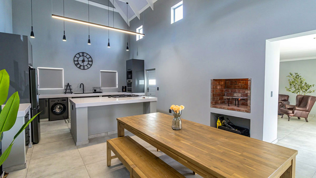 The kitchen flows seamlessly into the dining area, which features an indoor braai and television, creating an inviting space for shared meals and entertaining. The lounge offers comfortable seating for relaxation, while additional amenities include air conditioning in selected rooms and complimentary Wi-Fi throughout the home.