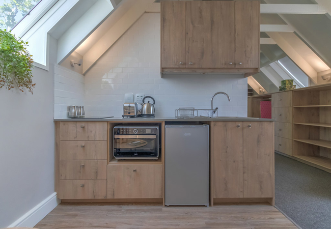 The kitchenette is equipped for self-catering and contains a stove, small oven, bar fridge, microwave, cutlery and crockery. The unit also has two comfy chairs and a flat-screen TV with selected DStv / satellite channels. Free Wi-Fi access is also provided.